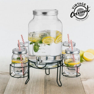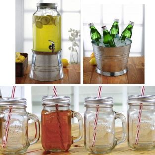 Prepare sus actos festivos, con este dispensador de bebidas y el 4 tazas tarro de albañil! Esta máquina de bebidas de moda y retro, que traerá satisfacción para todos los eventos tales como bodas, babyshower, recepción. Equipado con una tapa de metal y un grifo, sino que también se acompaña de un cubo de hielo que se puede utilizar para poner sus botellas fresco. Viene con el paquete de 4 tazas con cierre.