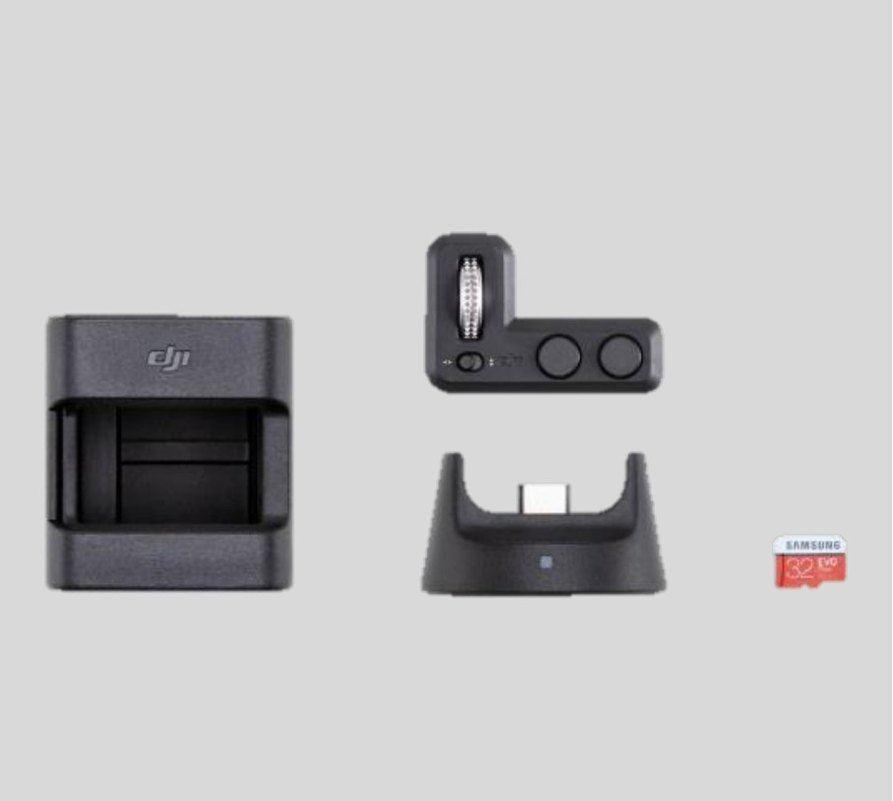 El kit de expansión de bolsillo Osmo de DJI viene con la rueda de control, el módulo inalámbrico, el soporte para accesorios y una tarjeta microSD de Samsung de 32 GB para ofrecerle una libertad creativa aún mayor con su cámara de bolsillo Osmo de DJI.