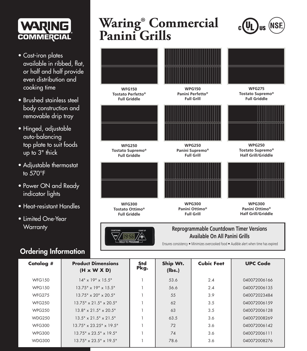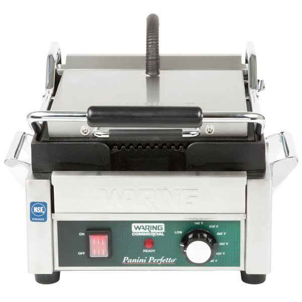 Prepare sándwiches de panini perfectamente asados ​​y más con la parrilla Panini de estilo italiano compacta 120 W Waring® WPG150. Las placas ranuradas de hierro fundido se calientan uniformemente y rápidamente cocinan sándwiches, hamburguesas, pollo y verduras de hasta 3 «de espesor. Su cuerpo de acero inoxidable cepillado y su bandeja de goteo extraíble son fáciles de limpiar. Incluye termostato ajustable a 570 ° F junto con POWER y READY direccionales.