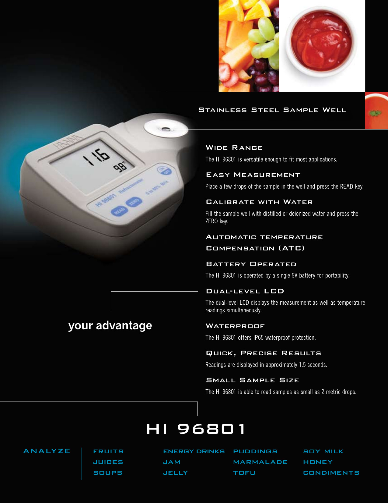 La actual medida para el índice refractivo es simple, fácil y provee al operador un método estándar aceptado para el análisis del contenido de azúcar. las muestras son medidas después de una simple calibración que hace el usuario con agua desionizada o destilada.