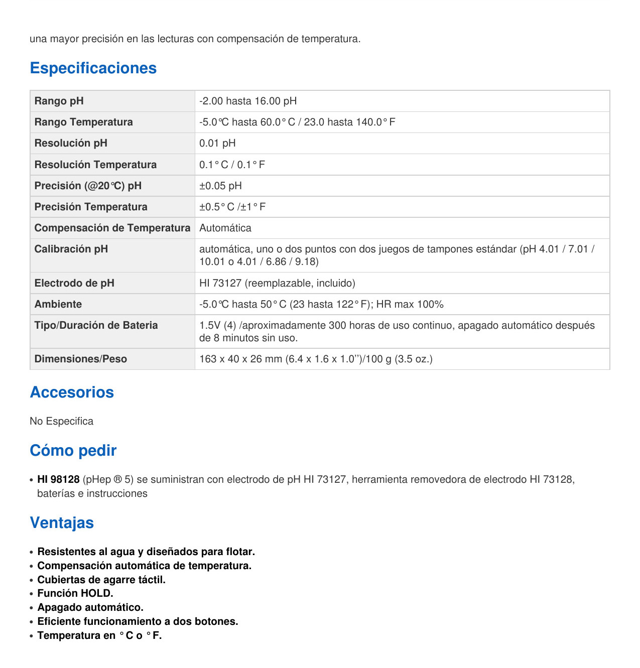 EL HI98128 (pHep®5) incluye un electrodo de pH HI73127 y una herramienta para quitar el electrodo HI73128, baterías e instrucciones.