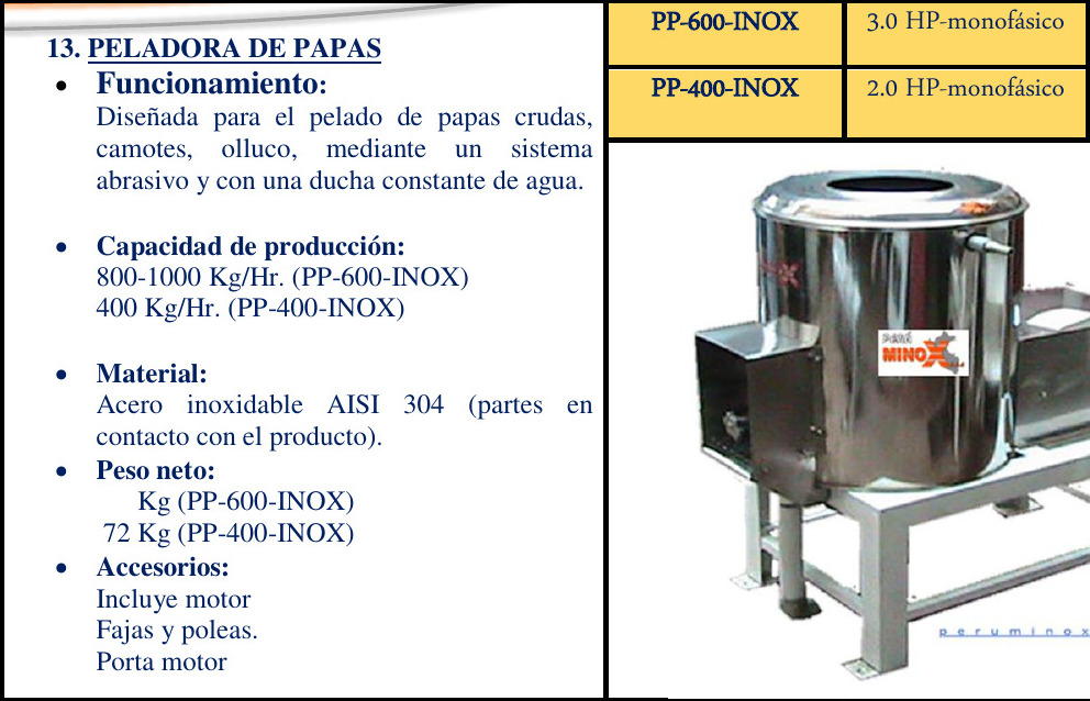 PELADORAS – > MARCA: PERUMINOX -> MODELO: PP-600-INOX ; REALIZAMOS ENVIOS A TODO EL PERU PERUMINOX ENTREGA INMEDIATA