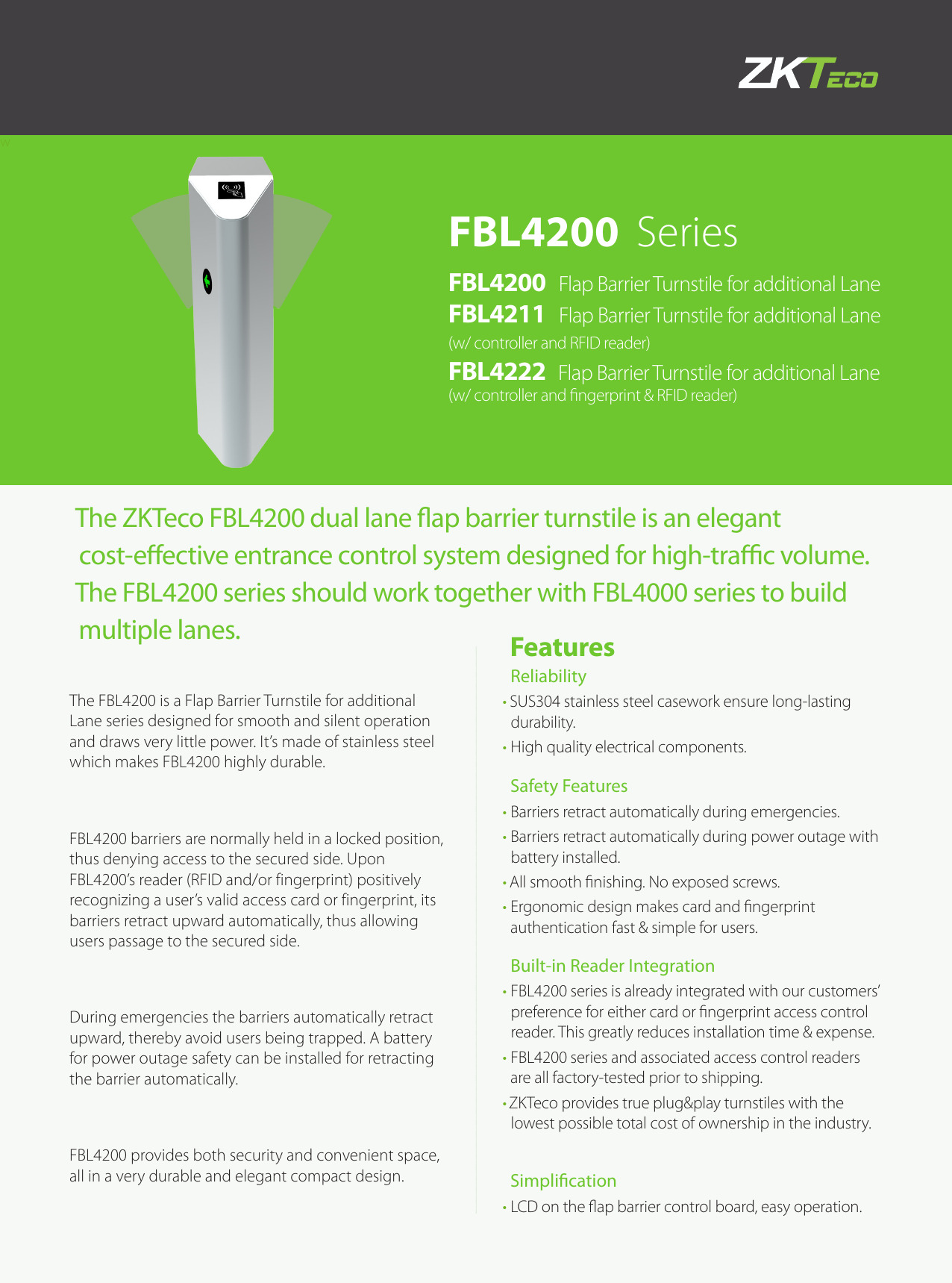 El torniquete ZKTeco FBL4200 para barreras de doble carril es un sistema de control de entrada elegante y económico, diseñado para un alto volumen de tráfico. La serie FBL4200 debe trabajar junto con la serie FBL4000 para construir múltiples carriles.