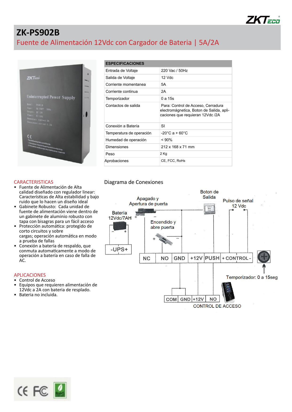 Para: Control de Acceso, Cerradura electromágnetica, Boton de Salida, aplicaciones que requieran 12Vdc /2A