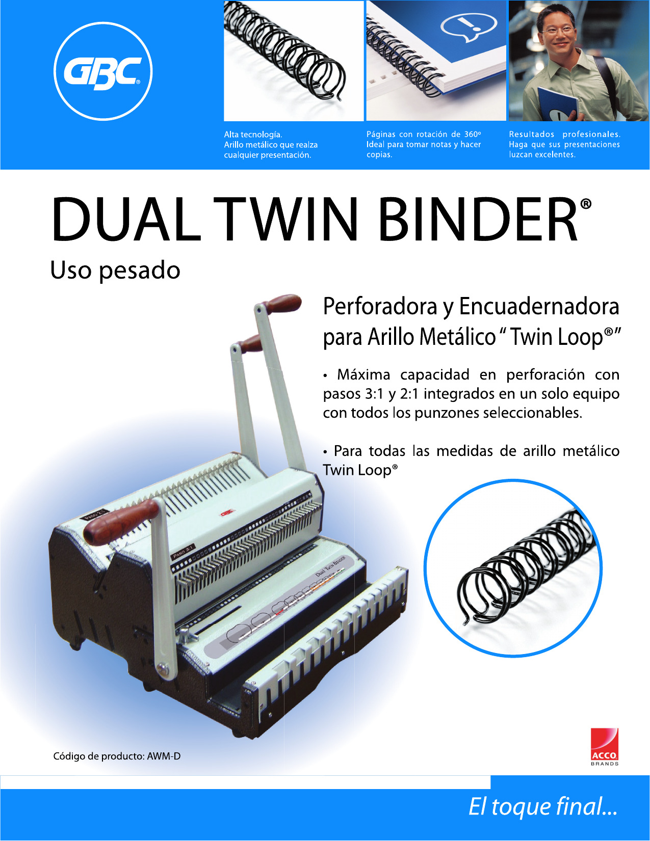 Dual TwinBinder es el equipo más completo para engargolar, ya que con un solo equipo podrás crear encuadernados con arillo metálico en todas las medidas, ya sean paso 2:1 o 3:1; dándote la posibilidad de encuadernar trabajos desde 1 hoja hasta de 280 hojas.