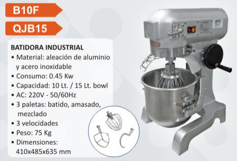 Batidora Multifuncional de 10 litros Amasadora y Mezcladora, diseñada y producida bajo estándares europeos y según el requerimiento nacional. Este equipo construido en fierro fundido y accionado por un motor y un juego de engranajes harán de sus productos un manjar satisfaciendo así sus expectativas deseadas. Por su gran demanda, hacen de este equipo muy confiable y seguro por los maestros operarios, siendo así usados en distintas líneas como la Panadera, Pastelería, Baguetería, Carnicería, Mezclados de polvos, líquidos, etc.