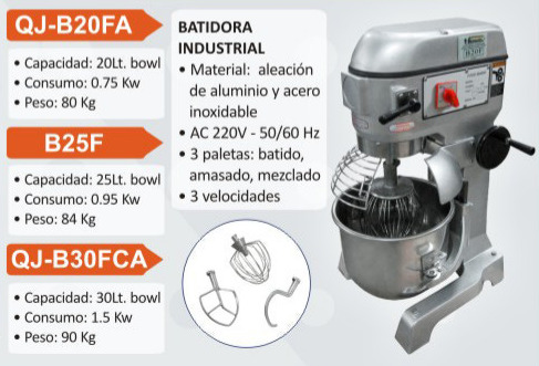 Batidora Amasadora y Mezcladora Multifuncional de 25 litros, diseñada y producida bajo estándares europeos y según el requerimiento nacional. Este equipo construido en fierro fundido y accionado por un motor y un juego de engranajes harán de sus productos un manjar satisfaciendo así sus expectativas deseadas. Por su gran demanda, hacen de este equipo muy confiable y seguro por los maestros operarios, siendo así usados en distintas líneas como la Panadera, Pastelería, Baguetería, Carnicería, Mezclados de polvos, líquidos, etc.