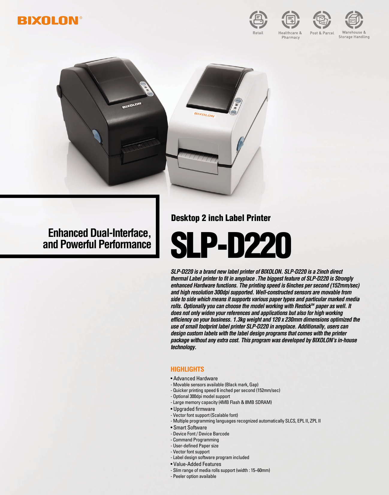 La SLP-D220G es una nueva impresora térmica directa de etiquetas de 2 pulgadas diseñada para encajar en cualquier lugar. La característica más importante de SLP-D220G son las funciones de hardware fuertemente mejoradas. Se admite la velocidad de impresión de 6 pulgadas / segundo (152 mm / seg) y la alta resolución de 203 ppp. Los sensores bien construidos se pueden mover de lado a lado, lo que significa que admite varios tipos de papel y rollos de papel marcados en particular. Cuenta con una gran capacidad de memoria (4MB Flash y 8MB SDRAM) y firmware actualizado para admitir fuentes vectoriales.