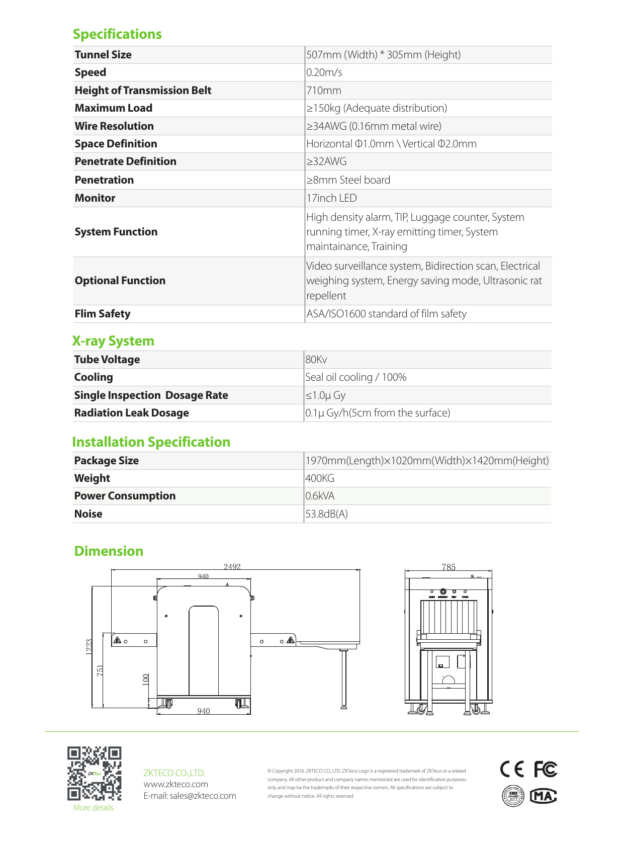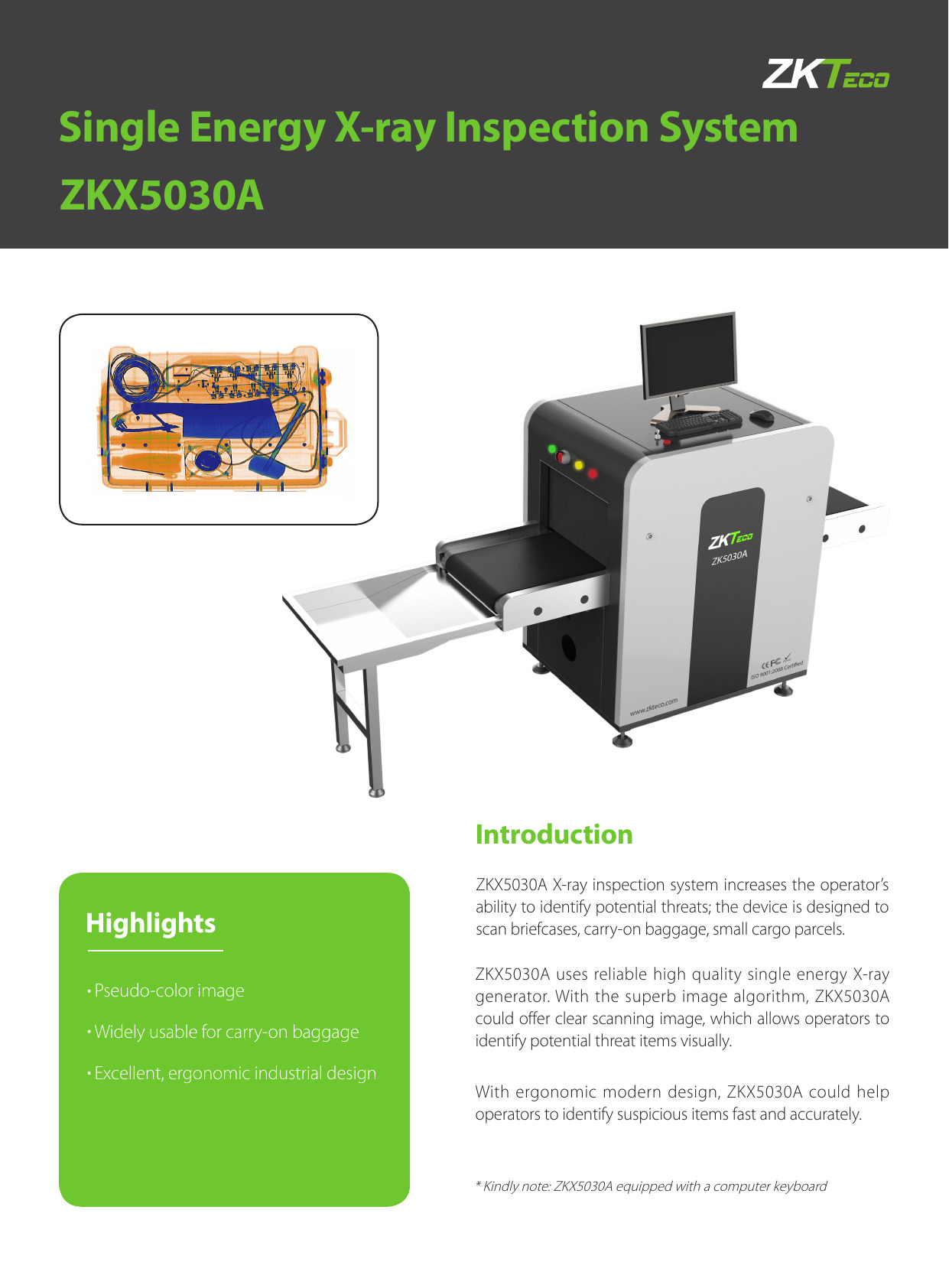 ZKX5030A utiliza un generador de rayos X de energía única confiable y de alta calidad. Con el excelente algoritmo de imagen, ZKX5030A podría ofrecer una imagen de escaneo clara, lo que permite a los operadores identificar visualmente los posibles elementos de amenaza