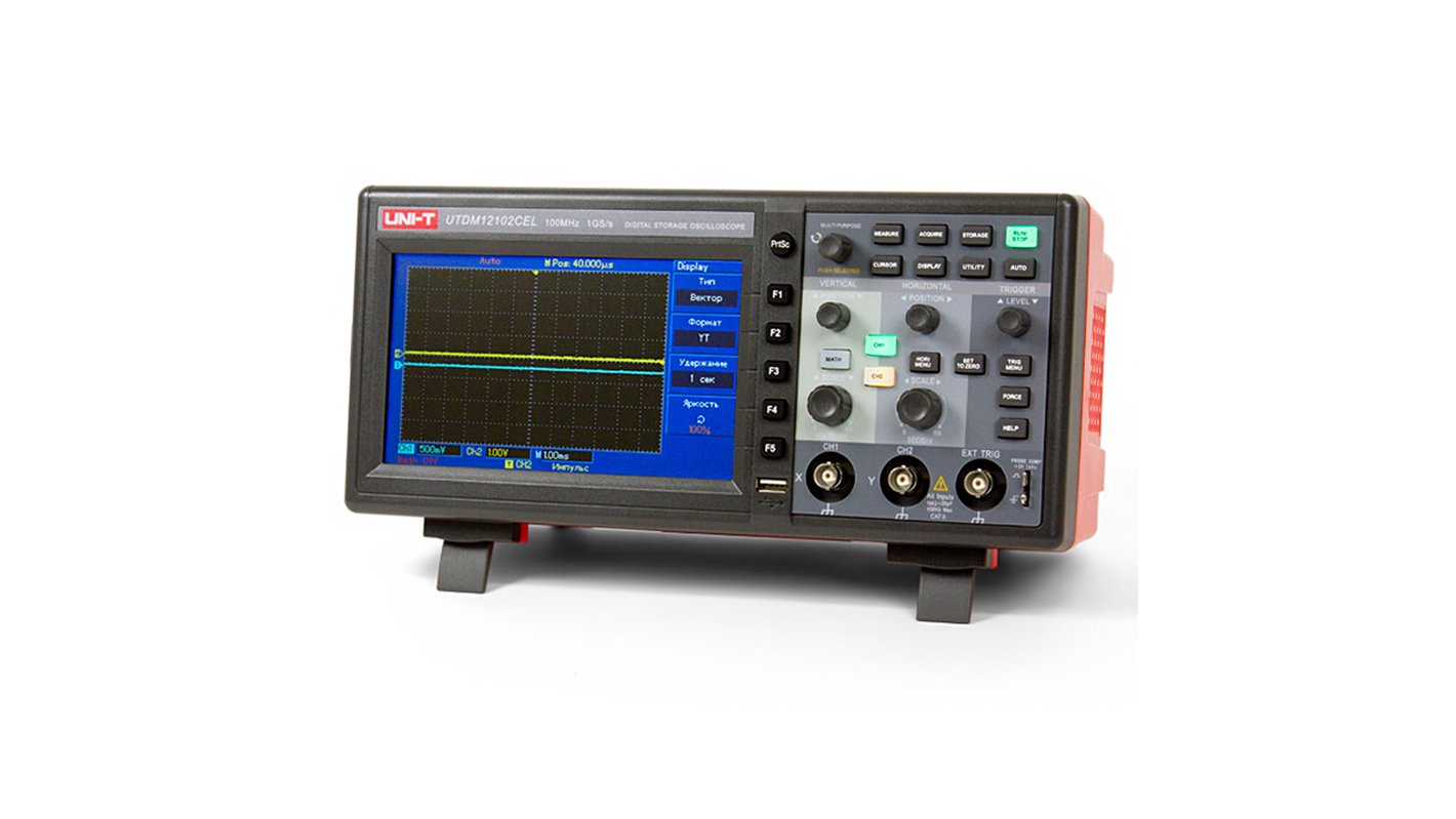 UNI-T UTD2102CEL es un osciloscopio digital de dos canales con ancho de la banda 100 MHz, frecuencia de muestreo 1 GS/s y memoria interna hasta 2 × 600 K. Puerto USB permite conectar memorias externas.
