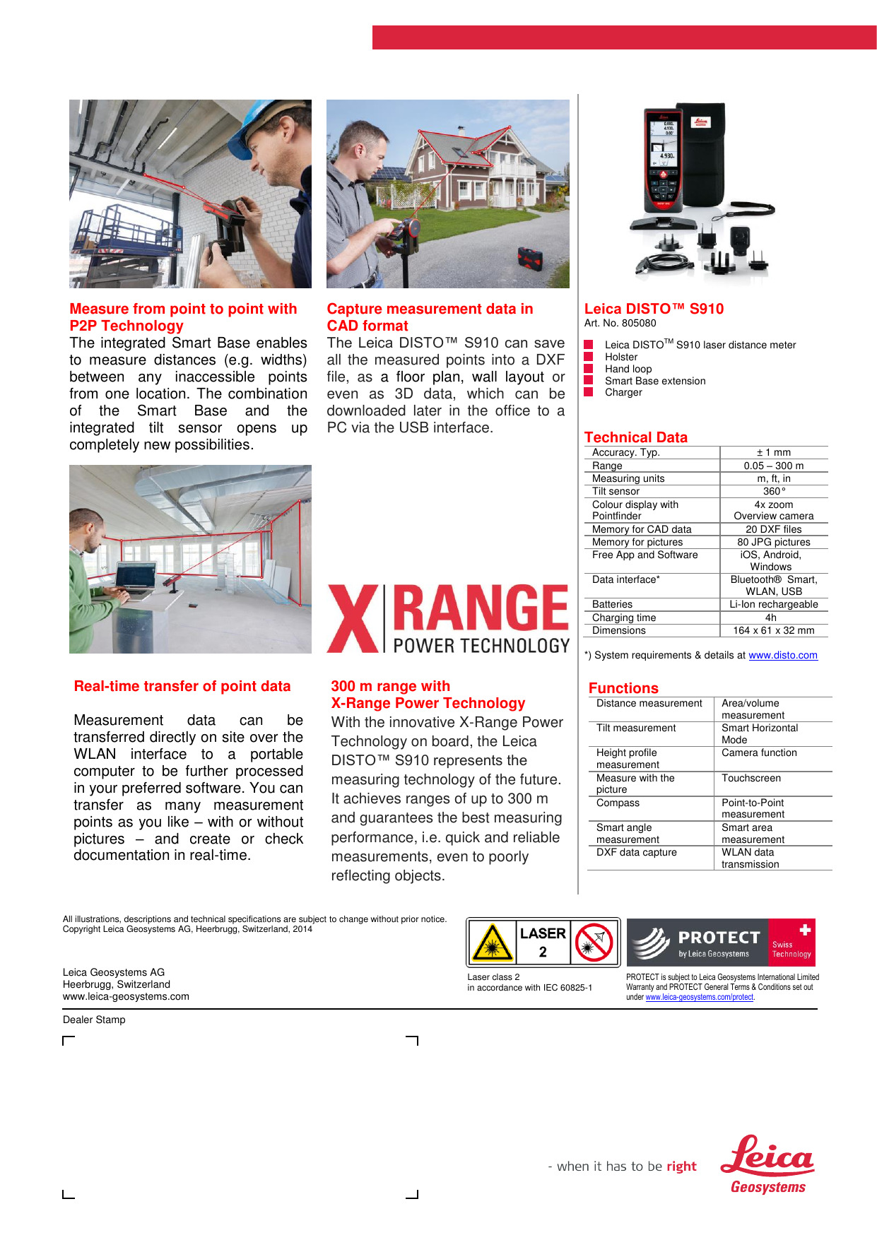 Con la innovadora Tecnología X-Range Power se integra en el Leica DISTO™ S910 la tecnología del futuro. Esto permite alcances de hasta 300 m y garantiza las mejores mediciones incluso en objetivos poco reflectantes o con luz solar intensa.