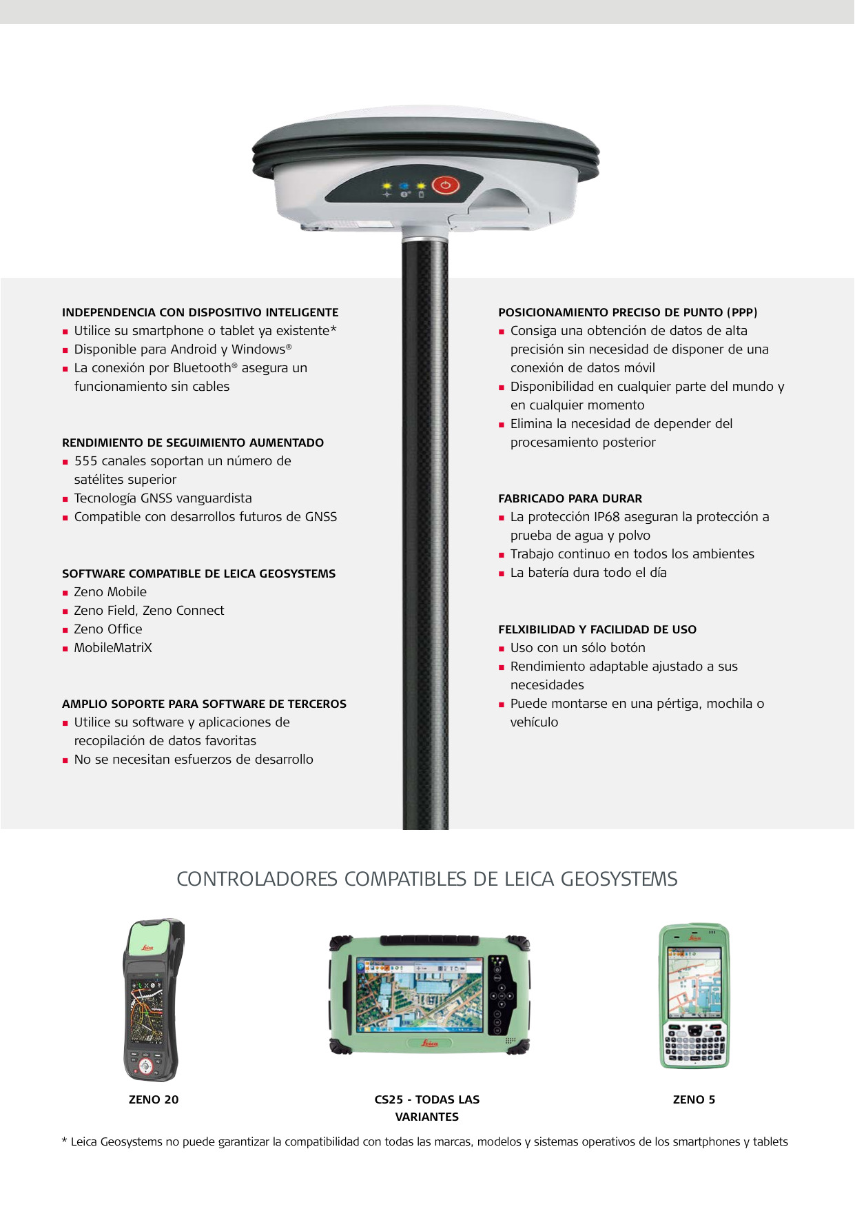 La innovación más moderna en la gama Leica Zeno puede emparejarse con todas las computadoras de mano Zeno existentes y una amplia gama de dispositivos inteligentes Windows® o Android, llevando la tecnología GNSS de primera línea y el poder de seguimiento de 555 canales líder en la industria.