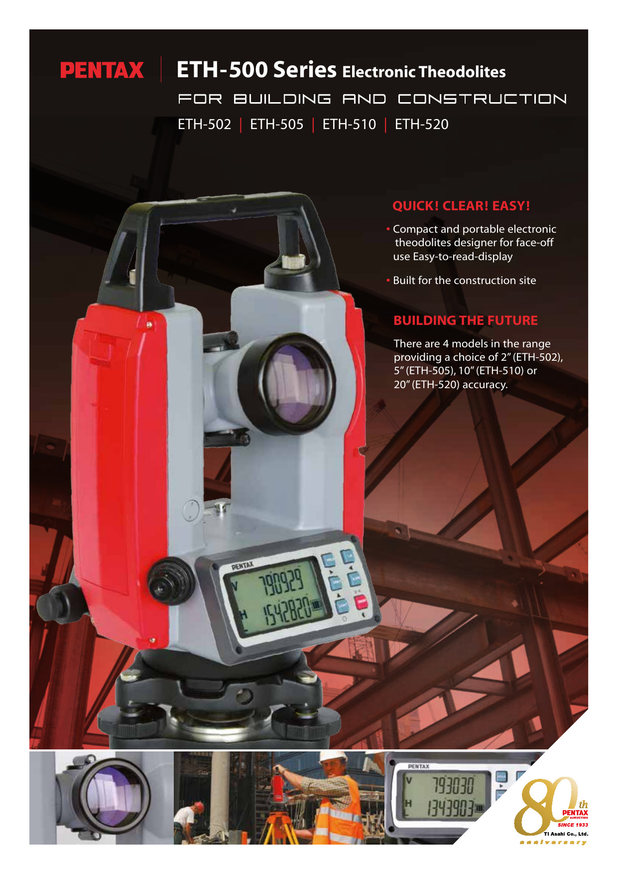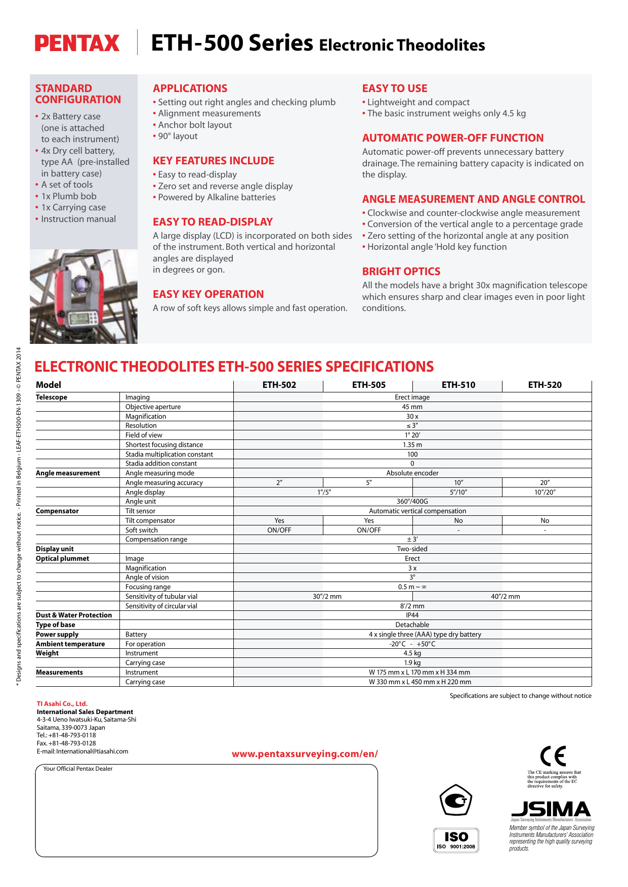 El Teodolito Pentax ETH-502 es pequeño y liviano, lo que permite su transporte con gran facilidad. Posee óptica de alta calidad, con un aumento de 30X y apertura de 45mm, brindando una excelente luminosidad.