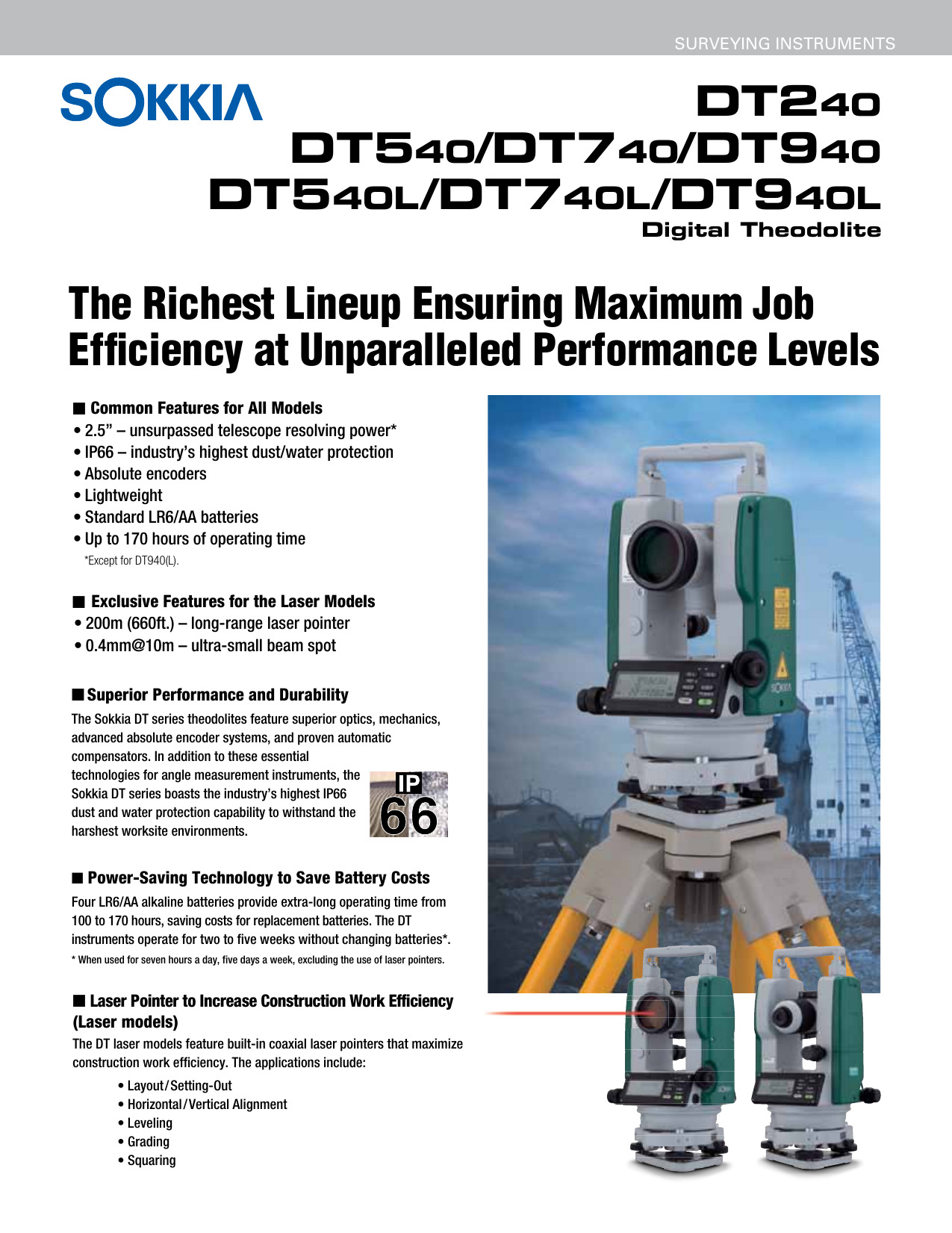 Además de estas tecnologías, la serie DT940 SOKKIA ofrece a la industria de la más alta capacidad de protección del polvo y agua IP66 probado para resistir los ambientes más duros en lugares de trabajo.