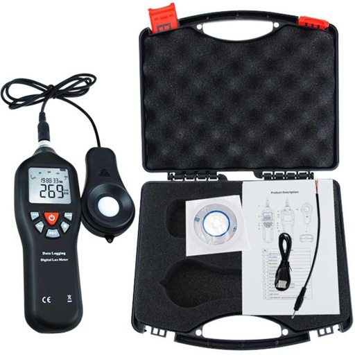 Este multímetro portátil digital Lux con interfaz de PC puede medir hasta 200.000 lux. Se utiliza para comprobar el nivel de luminancia, la medida de la