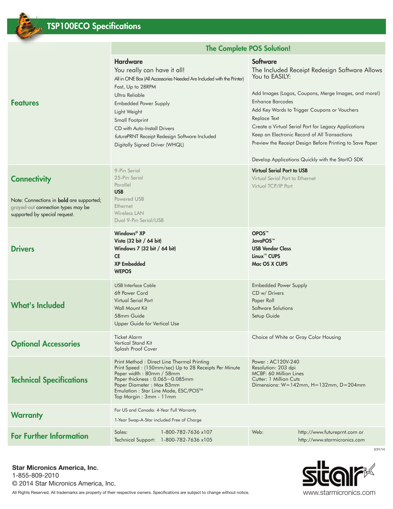 La impresora tsp100eco, la primera eco del mundo pos, se extiende el legado que es aún más la tsp100 futureprnt. El tsp100eco soporta Star el compromiso de ser ecológicamente responsable, a la vez que permite Star para continuar para proporcionar una alta velocidad, Software enriquecido, opción económica para los usuarios.