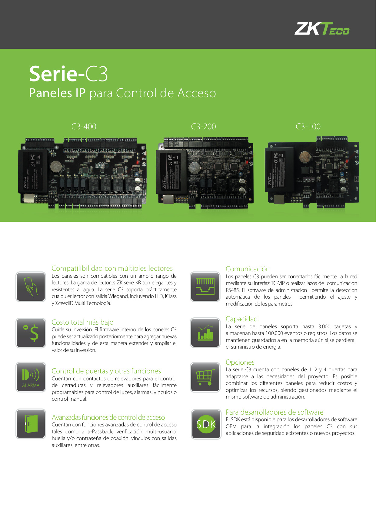 La serie de paneles C3 ofrece una avanzada solución de control de acceso para pequeñas, medianas y grandes empresas, siendo ideales para aplicaciones con lector de proximidad o teclado para su uso con tarjetas o contraseñas.