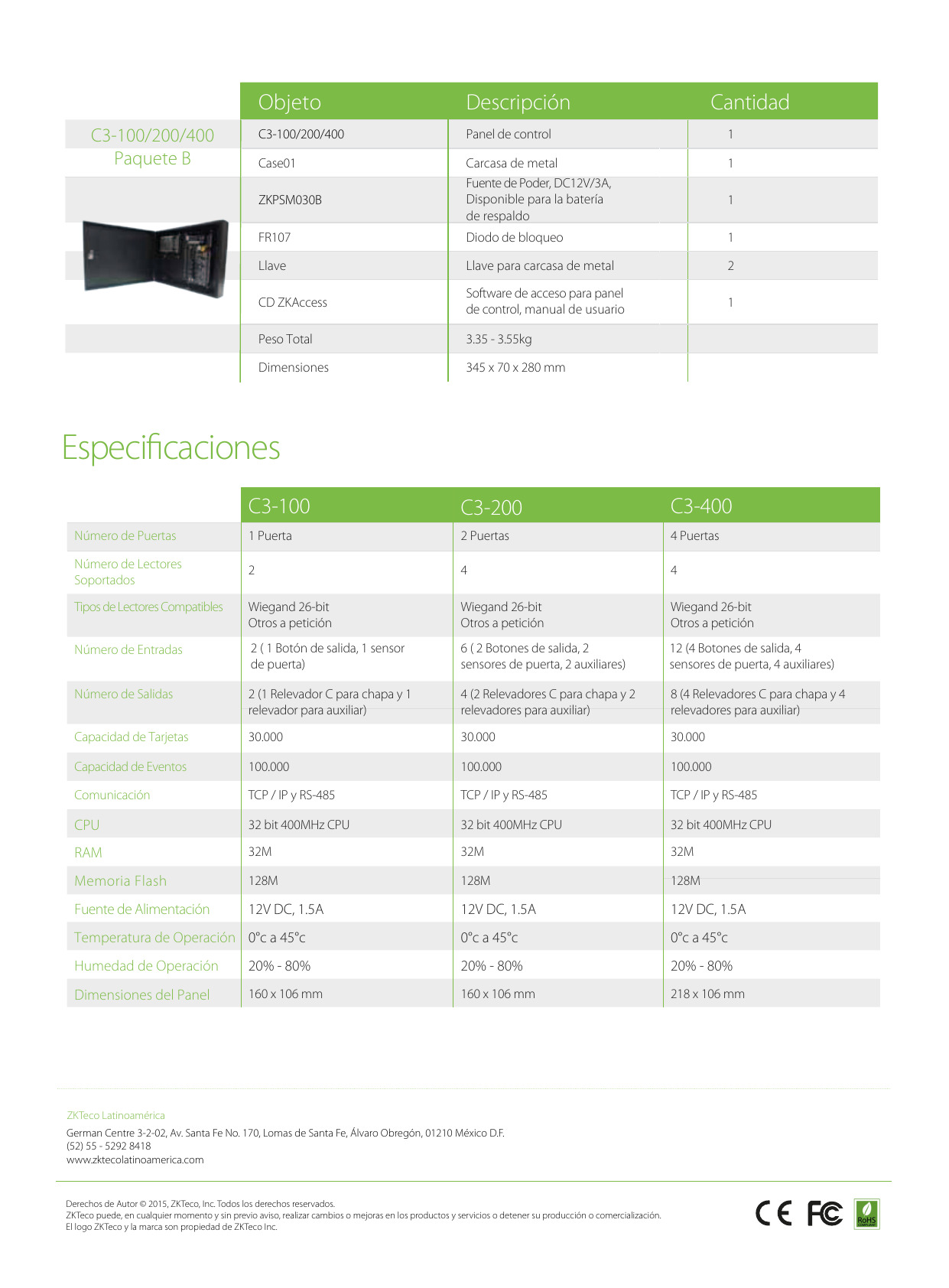 PANEL DE CONTROL DE ACCESO MARCA: ZKTECO MODELO: C3-400 PACKAGE B