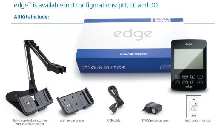 Programado para modos básicos y avanzados, Edge ofrece funciones de pantalla simplificadas para mediciones de rutina o visualización detallada de datos. Advierte a los usuarios si el electrodo no está limpio o si los tampones se contaminan durante la calibración utilizando la función exclusiva de CAL-CHECK de Hanna.