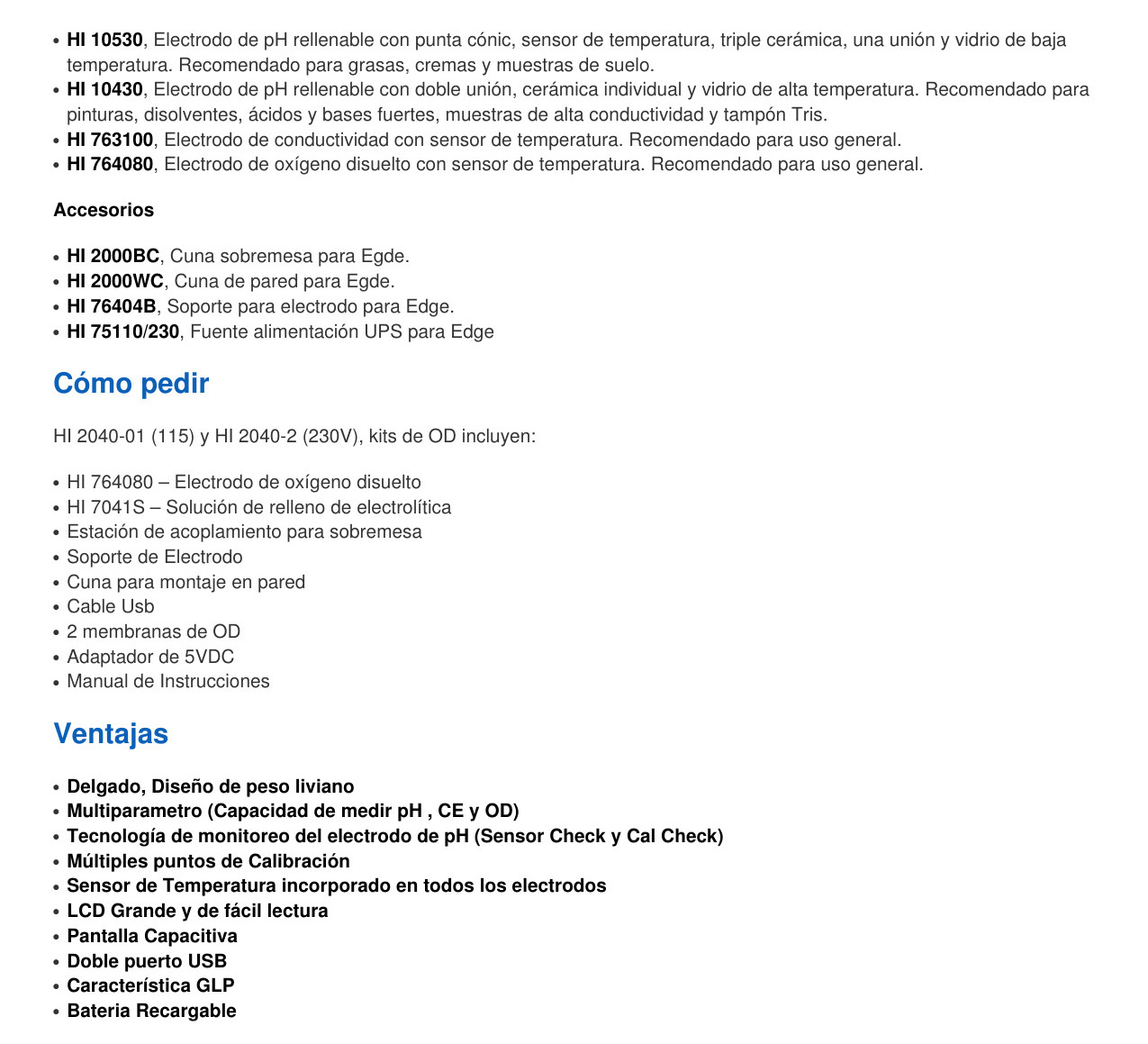 Información sobre pedidos HI2040 El kit de OD incluye: HI764080 Electrodo de oxígeno disuelto, HI7041S Solución de electrolito de relleno, 2 tapas de membrana de DO, 2 juntas tóricas de tapa de membrana de OD y certificado de calidad.