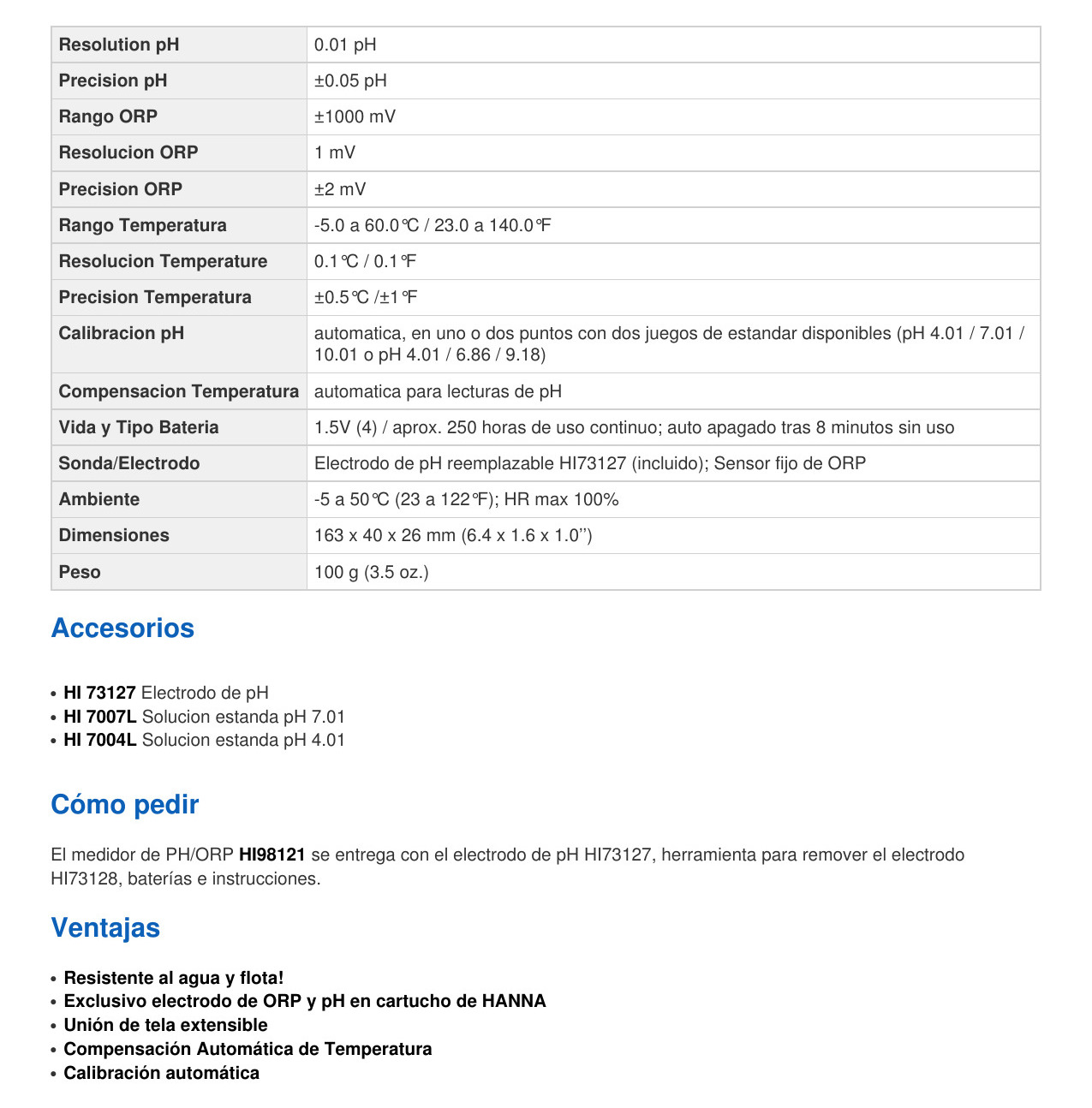 Información para ordenar El HI98121 (ORP / pH) se suministra con electrodo de pH HI73127, herramienta de extracción de electrodo HI73128, baterías y manual de instrucciones.