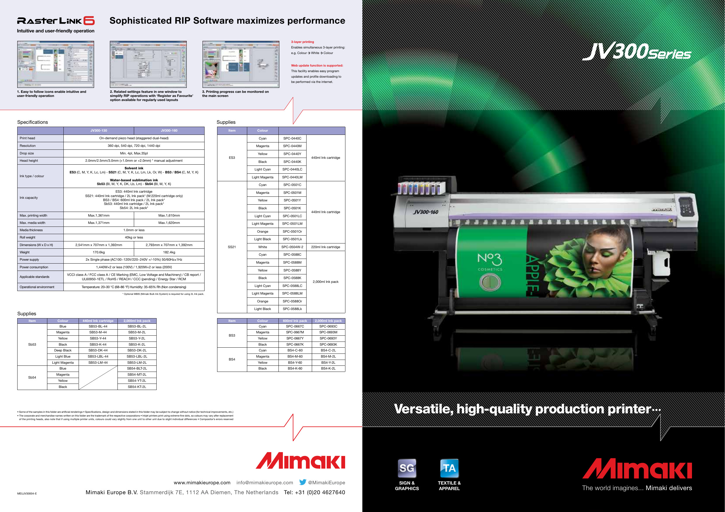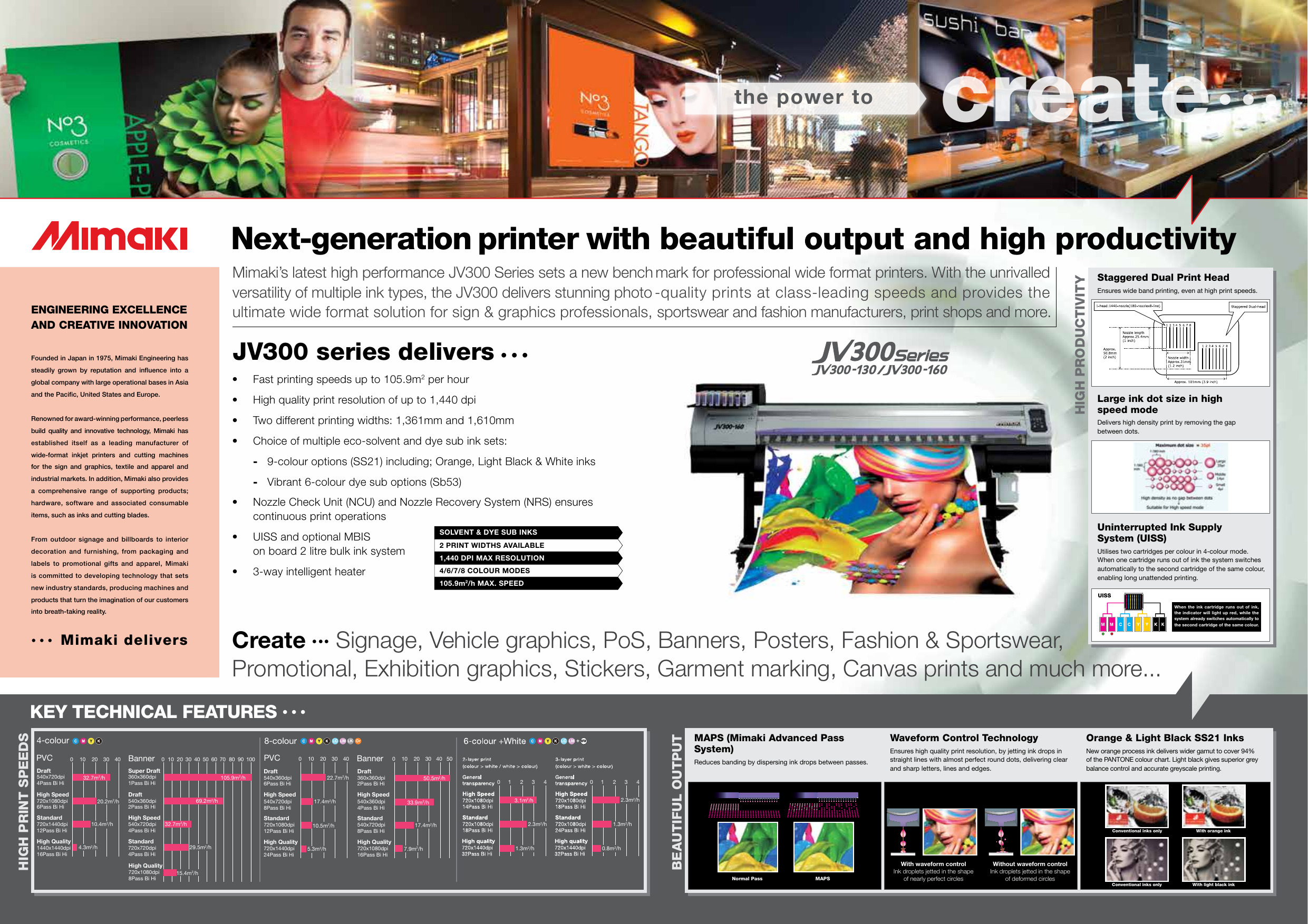 Las Series Mimaki JV300 de alto rendimiento establecen un nuevo punto de referencia para las impresoras profesionales de gran formato. Con la versatilidad inigualable de múltiples tipos de tinta, la JV300 ofrece impresionantes imágenes de calidad fotográfica a velocidades líderes en su clase y proporciona la última solución de gran formato para profesionales de rotulación y gráficos, fabricantes de moda y ropa deportiva, tiendas de impresión y mucho más.