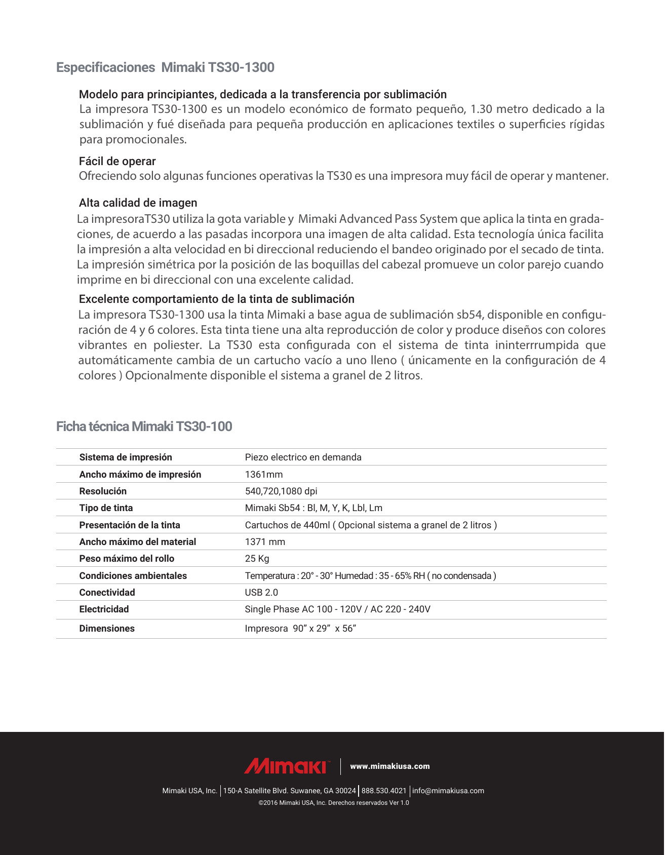 Aspectos destacados de la impresora Mimaki TS30-1300: